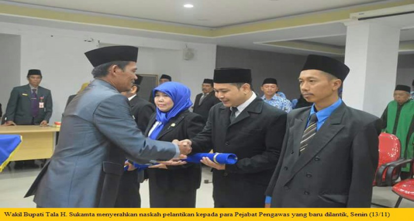 Tala-Kominfo, Empat orang Pejabat Pengawas dilingkungan Pemerintah Kabupaten Tanah Laut(Tala) dilantik oleh Wakil Bupati Tala H. Sukamta di Ruang Barakat Sekretariat Daerah Tala, Senin (13/11). Dihadiri oleh Sekretaris Daerah H. Syahrian Nurdin, Kepala Badan Kepegawaian dan PSDM Tala Husein Irianta serta Kepala Satuan Kerja Perangkat Daerah di Lingkup Pemerintah Kabupaten Tala.